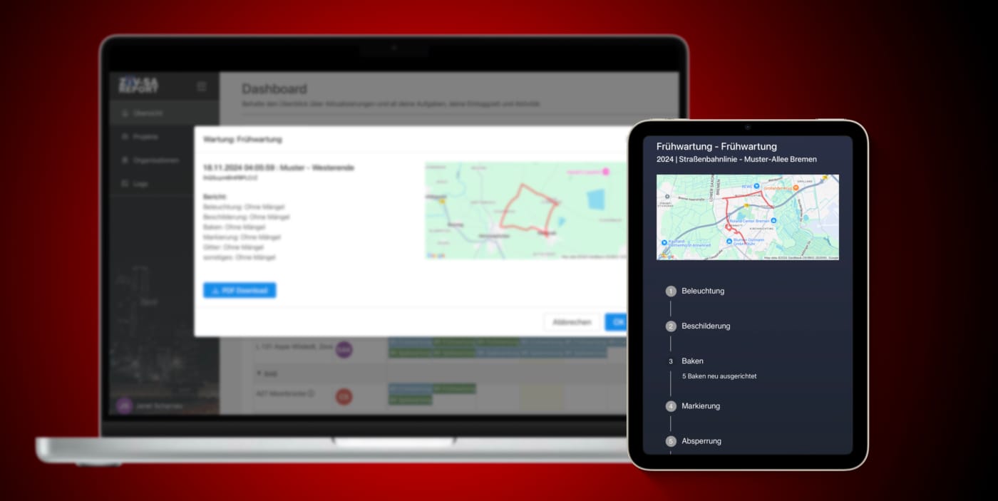 ZTV-SA Report ist die mobile Lösung zur Disposition, Erfassung und Dokumentation von Wartungseinsätzen nach den Vorgaben der ZTV-SA. Über ein mobiles Smartphone oder Tablet werden Zeitpunkt und Ort (via GPS) des jeweiligen Wartungseinsatzes in Echtzeit erfasst und dokumentiert. Zu jedem Wartungseinsatz lassen sich individuell bestimmbare Prüfkriterien erfassen. Fotos, die bei einer Wartungsfahrt gemacht wurden, sind automatisch dem jeweiligen Wartungsbericht zugeordnet.